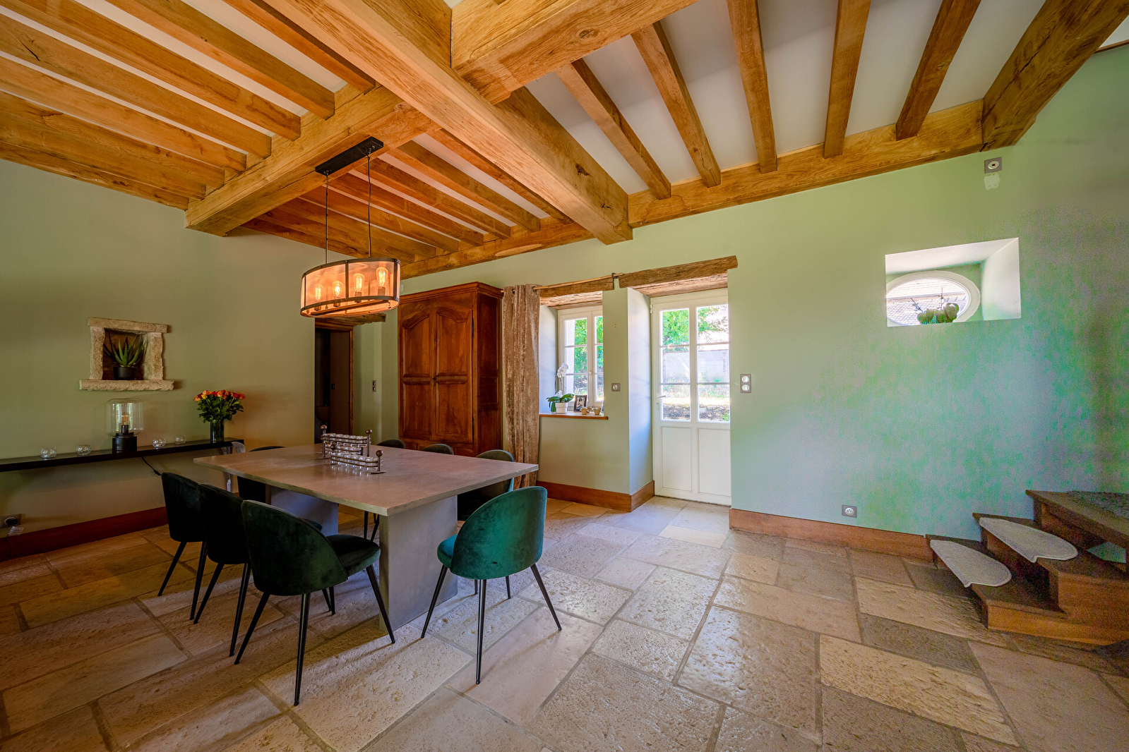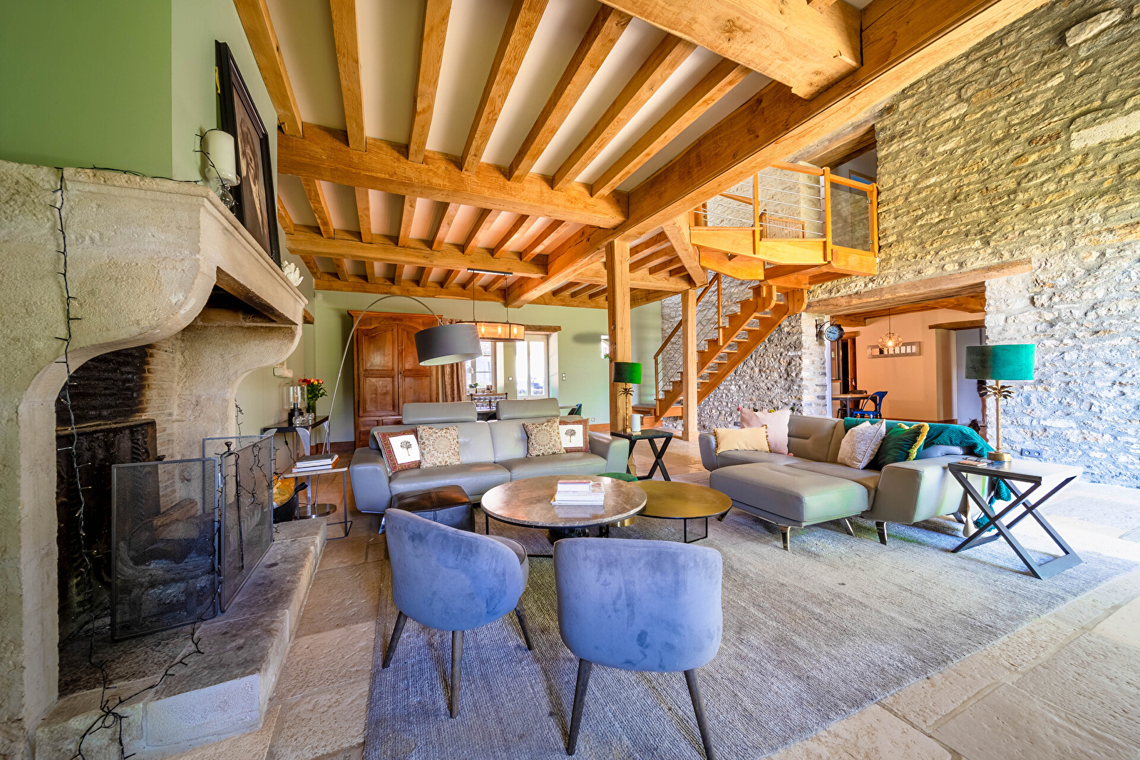 Située dans un paisible hameau, cette ancienne grange restaurée avec soin offre une véritable immersion dans l’élégance rustique bourguignonne. Murs en pierre apparente, poutres majestueuses, sols en tomettes et en pierre naturelle : chaque détail a été pensé pour conjuguer caractère d’antan et confort contemporain.